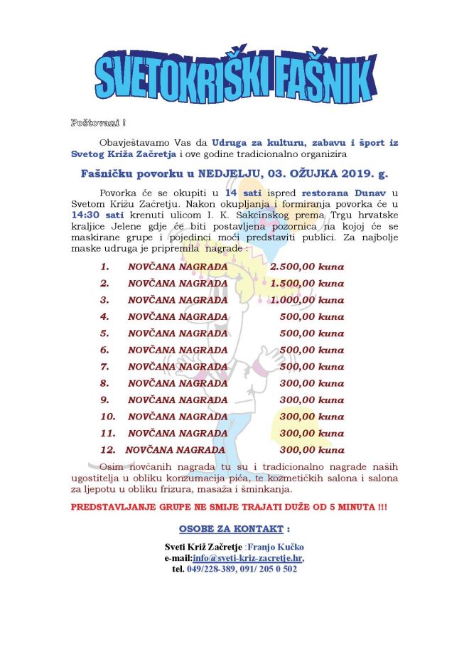 Udruga za kulturu, zabavu i šport tradicionalno organizira fašničku povorku u nedjelju 3. ožujka. Povorka će se okupiti ispred restorana Dunav u Svetom Križu Začretju. Nakon okupljanja i formiranja povorka će u 14:30 krenut će Ulicom I. K. Sakcinskog prema Trgu hrvatske kraljice Jelene gdje će biti postavljena pozornica na kojoj će se maskirane grupe i pojedinci moći predstaviti publici. Za najbolje maske osigurane su bogate nagrade.