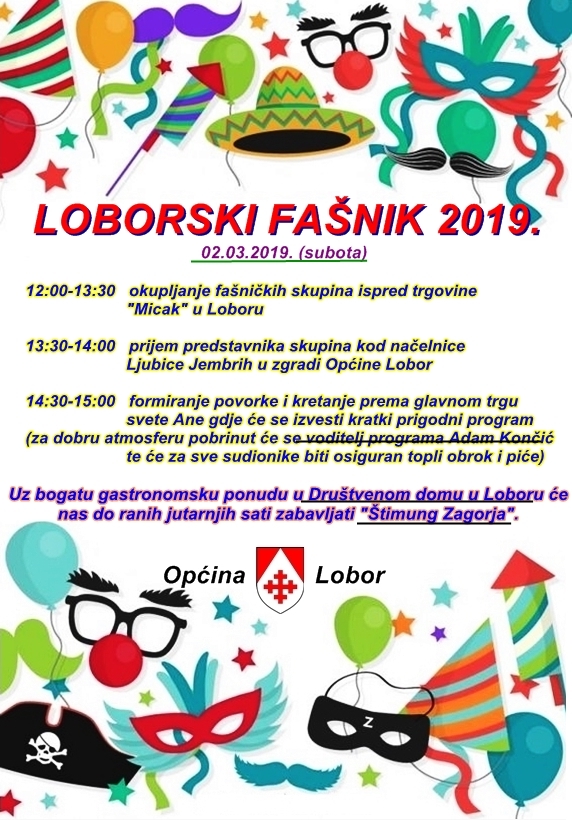 Loborski fašnik će se održati u subotu 2. ožujka. Okupljanje fašničkih skupina je ispred trgovine 'Micak' u Loboru od 12 do 13:30 sati. Od 13:30 do 14 sati predviđen je prijem predstavnika skupina kod načelnice Ljubice Jembrih u zgradi Općine. Formiranje povorke i kretanje prema glavnom trgu počinje od 14:30, a na trgu sve posjetitelje čeka prigodan program. Za dobru atmofseru će se pobrinuti voditelj programa Adam Končić. Za sve sudionike osigran je topli obrok i piće. Organizatori najavljuju kako će uz bogatu gastronomsku ponudu u Društvenom domu u Loboru će do ranih jutarnjih sati zabavljati 'Štimung Zagorje.'