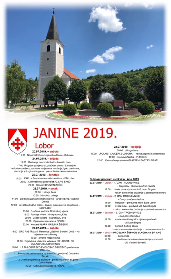 U petak, 26. srpnja na sam blagdan sv. Ane od 10,30 sati održava se mimohod loborskih udruga, u 11 sati bit će svečana sveta misa povodom župne zaštitnice, a u 13 svečana sjednica Općinskog vijeća općine Lobor.