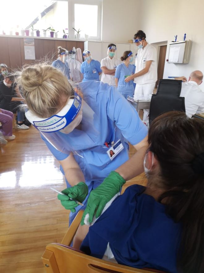 Učenici 5. Ma Srednje škole Bedekovčina za vrijeme vježbi iz Zdravstvene njege starijih osoba u Domu za odrasle osobe Lobor-grad sudjelovali su u procjepljivanju korisnika i djelatnika Doma protiv COVID - 19. Dr. Ivan Lipovac održao je kratko predavanje o vrsti cjepiva, načinu čuvanja, distribuciji, pripremi i primjeni cjepiva. Nakon predavanja učenici su pod budnim okom dr. Lipovca, sestre Barbare Sokolić, voditeljice zdravstvene njege u Domu, i mentorice Štefice Sukreški cijepili korisnike i djelatnike doma.