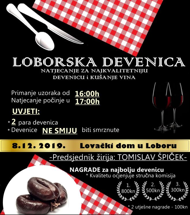 - Loborska devenica kulinarska je manifestacija koja se u Loboru održava ove godine po šesti puta. Održat će se u nedjelju 8. prosinca od 17 sati u Lovačkom domu u Loboru. I ove će godine žirijem predsjedati poznati kuhar Tomislav Špiček, a uz natjecanje za najbolju devenicu organizirano će biti i kušanje vina. Pozivamo sve zainteresirane građane da se prijave na manifestaciju, gdje su uz dobru zabavu pripremljene i nagrade za najbolje devenice, koje moraju biti pripremljene na tradicionalni način našeg podneblja - pozvala je načelnica Ljubica Jembrih.