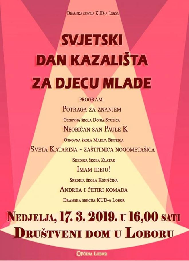 Dramska sekcija KUD-a Lobor organizira Svjetski dan kazališta za djecu i mlade ove nedjelje 17. ožujka u društvenom domu u Loboru s početkom u 16 sati. U programu će nastupiti najbolje dramske družine s ovogodišnje Smotre LiDraNo iz zagorskih osnovnih i srednjih škola i to OŠ Donja Stubica s predstavom 'Potraga za znanjem', OŠ Marija Bistrica koje će se predstaviti s komadom 'Neobičan san Paule K', SŠ Zlatar koje će odigrati predstavu 'Sveta Katarina - zaštitnica nogometašica', SŠ Konjščina s predstavom 'Imam ideju' te domaćin Dramska sekcija KUD-a Lobor koja će odigrati predstavu 'Andrea i četiri komada'. Dobrodošli – poručuju organizatori.