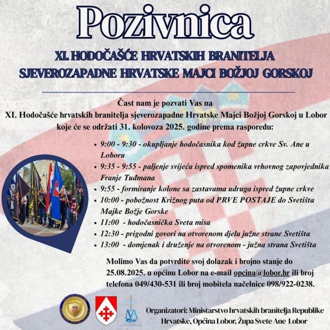 - Hodočašće Majci Božjoj Gorskoj u Loboru ima posebno značenje jer okuplja hrvatske branitelje, obitelji poginulih i cijelu zajednicu u molitvi i zahvalnosti. Pozivam sve da nam se pridruže u nedjelju kako bismo zajedno odali počast našim braniteljima i pomolili se Majci Božjoj Gorskoj - poručila je načelnica Jembrih.