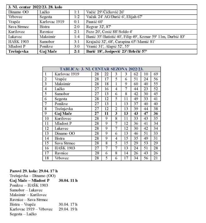 Danas je odigrano 28. kolo 3. NL centar. Gaj Mače je gostovao kod Trešnjevke, koja je slavila sa 2:1. Domaćini su svoje golove zabili već u prvoj četvrtini utakmice, praktički su u pet minuta riješili pitanje pobjednika. Vladimir Burić doveo je domaćine u vodstvo u 18. minuti, da bi Karlo Josipović u 23. minuti pogodio za 2:0. U nastavku Mario Brlečić uspio je smanjiti u 57. minuti, pogodivši za konačnih 2:1. Ovom pobjedom Trešnjevka je preskočila Gaj na osmom mjestu sa 38 bodova. Gaj ima na devetom mjestu 36, a već u nedjelju u 29. kolu čeka Mladost Petrinja, koja je stigla na dva boda zaostatka na 11. mjestu. Na vrhu je čini se sve riješeno, jer je u derbiju Karlovac pobijedio Vrapče 1:0 i odvojio se na 13 bodova.