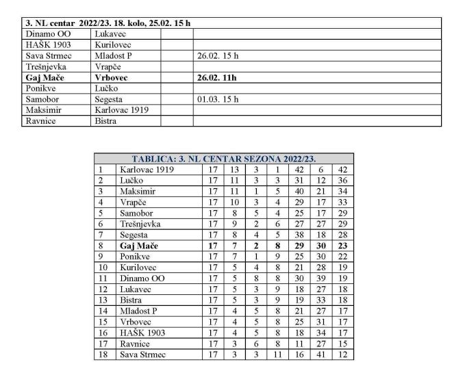 Danas počinje proljetni dio natjecanja u 3. NL centar. Većina utakmica igra se danas, no zagorski predstavnik igra sutra u 11 sati. što je uobičajen termin domaćih utakmica Gaja. Sutra u Mače dolazi Vrbovec. To neće biti prva ovogodišnja prvenstvena utakmica Gaja, koji je već prošle nedjelje u zaostaloj utakmici zadnjeg jesenskog kola (17.) dočekao Vrapče i izgubio 1:2.