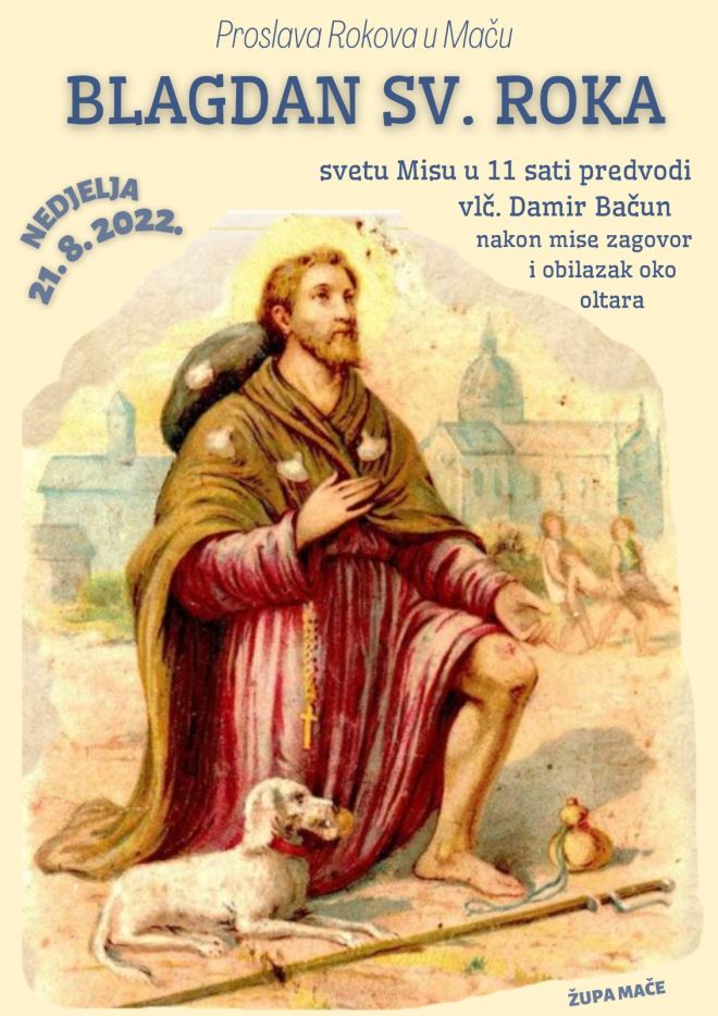 U nedjelju, 21. kolovoza, održat će se proštenje i proslava sv. Roka, suzaštitnika župe Bezgrešnog začeća Blažene Djevice Marije u Maču. Misu u 11 sati predvodit će vlč. Damir Bračun, a nakon mise održat će se zagovor i obilazak oko oltara.