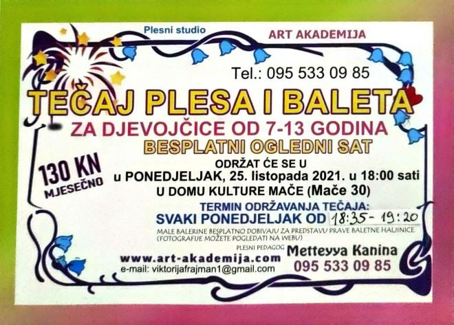 Plesni studio Art akademija poziva se djecu s područja Općine Mače te susjednih općina i grada da dođu na besplatni ogledni sat u ponedjeljak 25. listopada u 18 sati u Dom kulture u Maču, Mače 30. Termin održavanja tečaja je svaki ponedjeljak od 18.35 do 19.20 sati.