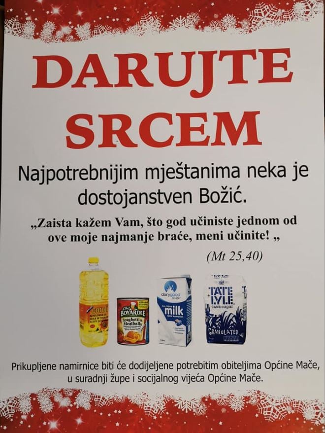 Sjetimo se i onih kojima će zima biti posebno teška jer uz nedostatak toliko potrebne ljudske topline, oskudjevaju i u osnovnim potrepštinama. U našim trgovinama nalaze se košare "Darujte Srcem" u koje možete ostaviti svoj prilog. Svoju donaciju također možete dostaviti kod našeg župnika Marka Toplaka u župnom dvoru i Socijalnog vijeća Općine Mače, paketi će biti dostavljeni najpotrebitijim žiteljima naše Općine. To je na svojem Facebooku profilu napisala načelnica Općine Mače, Mladenka Mikulec pozivajući tako da se svi koji kupuju odreknu jedne stvari koja im baš nije neophodna.