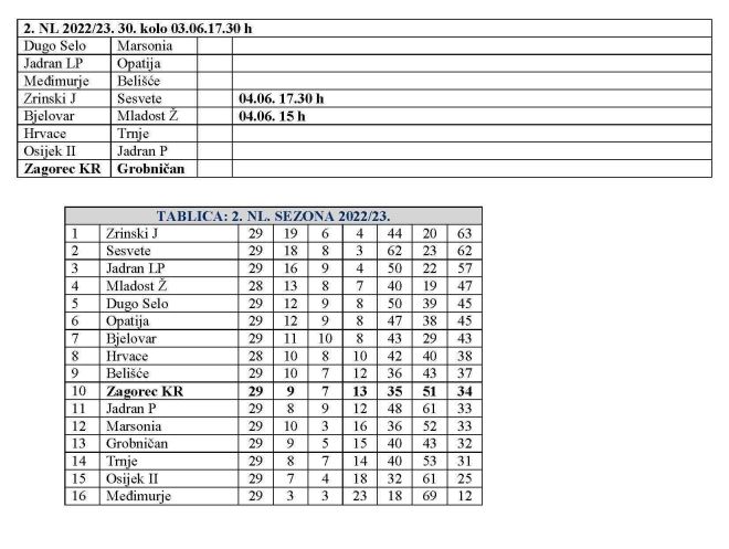 U 2. SuperSport NL Zagorec KR dočekuje danas Grobničan. Poznata su dva kluba koja će direktno ispasti, a zadnje kolo donosi borbu za izbjegavanje 14. mjesta koje vodi u dodatne kvalifikacije. Stoga je i ova utakmica zanimljiva. Zagorcu je dosta bod. Što se pak naslova tiče, o tome će odlučiti sutrašnja utakmica Zrinski J – Sesvete. Domaćinima je dosta bod, Sesvete za naslov trebaju pobjedu.
