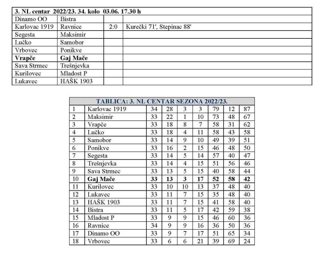 Gaj u Maču u zadnjem kolu 3. NL centar danas gostuje kod Vrapča. Gaj u zadnje kolo ulazi a 10. mjesta, Vrapče je treće, pa i favorit na kraju duge sezone, kada sigurno svi već iščekuju odmor. Inače, Karlovac je još jučer proslavio naslov, a danas se sve ostale utakmice zadnjeg kola igraju u 17.30 sati.
