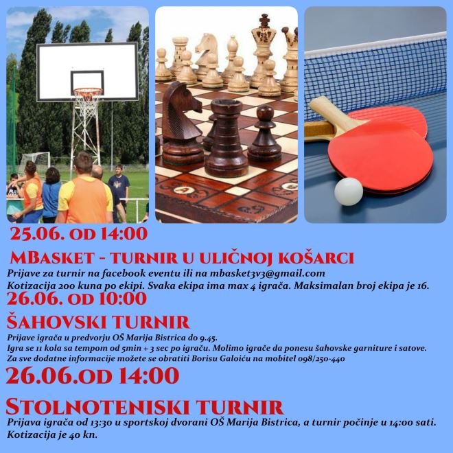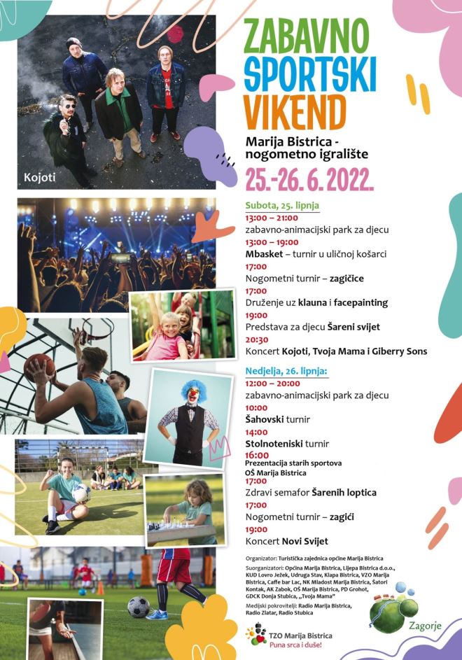 Ljeto u Mariji Bistrici ove godine donosi veliki Zabavno – sportski vikend 25. i 26. lipnja, u subotu od 13, a u nedjelju od 12 sati. Organizatori su osigurali besplatan zabavno-animacijski park za djecu, druženje uz klauna i facepainting. Subota donosi i turnir u uličnoj košarci od 13 sati, od 19 sati predstavu za djecu Šareni svijet, od 19.30 sati nogometno druženje i utakmicu zagičica NK Mladost MB protiv Selekcije zagićice KZŽ, i veliki večernji koncert na kojem će nastupiti ''Kojoti'', ''Tvoja Mama'' i "Giberry Sons".