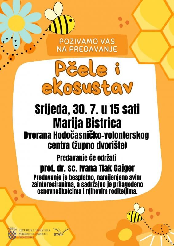 Udruga STAV iz Marije Bistrice ovoga tjedna organizira dva zanimljiva događanja. U srijedu od 15 sati prof. dr. sc. Ivana Tlak Gajger, dr. vet. med. u Hodočasničko-volonterskom centru u Mariji Bistrici održat će predavanje na temu ''Pčele i ekosustav''. Na predavanju se može saznati koliko su pčele važne za naš planet i naš opstanak, zašto su ključni dio zdravog ekosustava te koji su razlozi njihova nestanka.