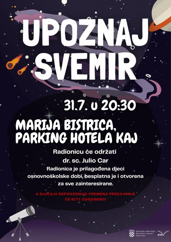 Dan poslije, u četvrtak s početkom u 20.30 sati na parkiralištu marijabistričkog Hotela Kaj dr. sc. Julio Car održat će predavanje i radionicu ''Upoznaj svemir''. Ova interaktivna radionica približit će daleka prostranstva svemira i pokazati kako svemir izgleda kroz oči fizičara, što znamo o svemiru i što još ne znamo te kako promatrati svemir teleskopom i golim okom. Ovo je događanje za sve uzraste – od znatiželjne djece do odraslih koji žele naučiti nešto novo, ističu u Udruzi STAV. Oba predavanja su besplatna, a ukoliko u četvrtak bude nepovoljno vrijeme, radionica se odgađa.