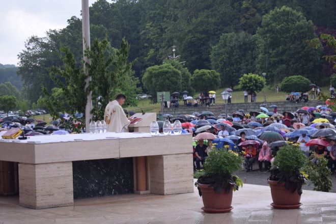 Iako se ujutro činilo da će ovo nestabilno lipanjsko vrijeme izdržati barem za vrijeme mise, koja je bila u Crkvi na otvorenom Blaženog Alojzija Stepinca, kiša je baš padala cijelo vrijeme.