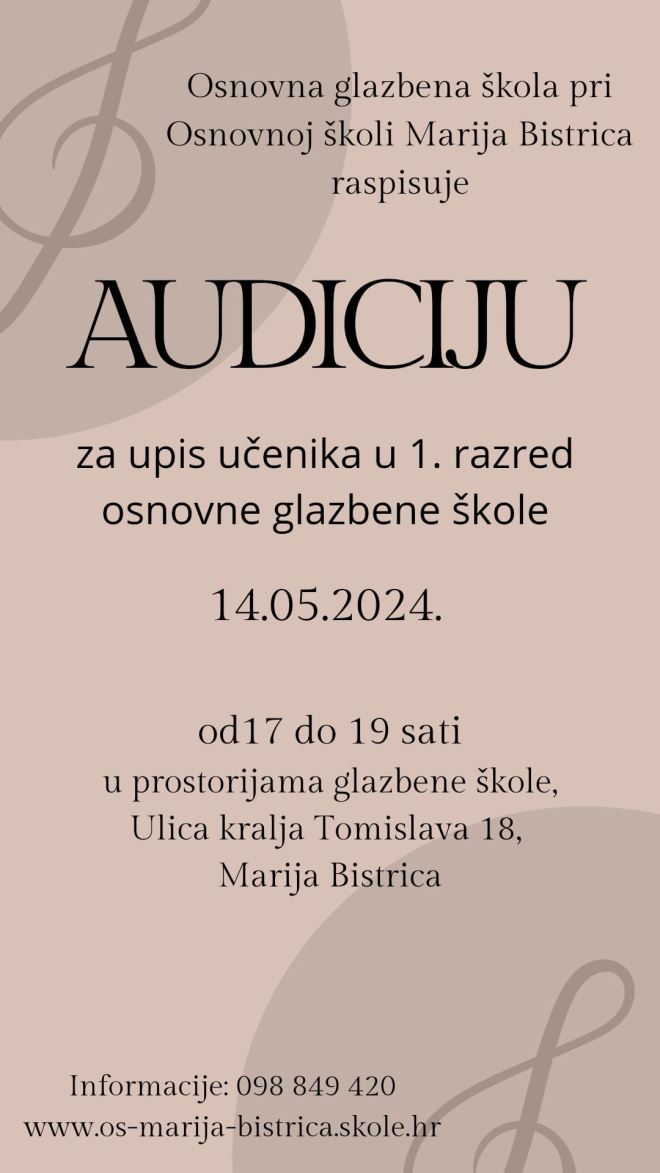 Glazbena škola pri OŠ Marija Bistrica poziva djecu na audiciju za upis u 1. razred glazbene škole. Audicija i upis će se održati u prostorijama škole u Ulici kralja Tomislava 18, u Mariji Bistrici, u utorak 14. svibnja, od 17 do 19 sati audicija i od 19.30 sati upisi. Učenici se mogu upisati na instrumente: tambure, trubu, saksofon, trombon, violinu, violončelo, harmoniku, klarinet, flautu, klavir i gitaru. Audicija je namijenjena učenicima koji će u školskoj godini 2024./2025. biti 2., 3. ili 4. razred osnovne škole (mogu pristupiti i učenici koji će u školskoj 2024./2025. biti 5. razred osnovne škole) i mlađi (u pravilu ne mlađi od sedam godina). Kandidati se mogu istodobno prijaviti za upis na najviše dva instrumenta, a nakon uspješno položene prijemne audicije upisati samo jedan instrument. Audicija se održava pred troje učitelja koji će ispitati sluh, ritam i glazbeno pamćenje. Za audiciju se ne treba pripremati, dovoljno je da dijete samo odabere jednu pjesmicu koju želi otpjevati na audiciji. Dodatne informacije mogu se dobiti na telefon 098/849 420.