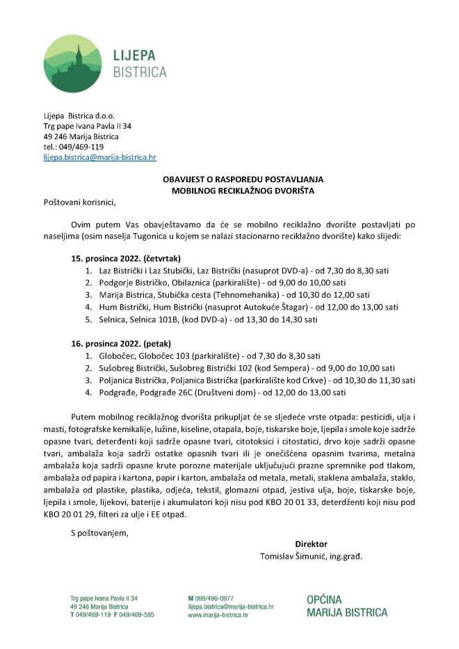 Komunalno poduzeće ''Lijepa Bistrica'' Marija Bistrica obavještava da će se mobilno reciklažno dvorište postavljati po naseljima (osim naselja Tugonica u kojem se nalazi stacionarno reciklažno dvorište) 15. i 16. prosinca. U četvrtak 15. prosinca mobilno reciklažno dvorište bit će postavljeno za naselja Laz Bistrički i Laz Stubički nasuprot Vatrogasnog doma od 7.30 do 8.30 sati, za Podgorje Bistričko na parkiralištu uz Bistričku obilaznicu od 9 do 10 sati, za Mariju Bistricu u Stubičkoj cesti kod bivše Tehnomehanike od 10.30 do 12 sati, za Hum Bistrički nasuprot Hyundai Štagar od 12 do 13 sati i za Selnicu kod Vatrogasnog doma u Selnici od 13.30 do 14.30 sati. U petak 16. prosinca mobilno reciklažno dvorište bit će postavljeno za naselje Globočec, na adresi Globočec 103 od 7.30 do 8.30 sati, za Sušobreg Bistrički, na adresi Sušobreg Bistrički 102 kod Sempera od 9 do 10 sati, za Poljanicu Bistričku na parkiralištu kod Kapele na Vinskom Vrhu od 10.30 do 11.30 sati i za Podgrađe, kod Društvenog doma od 12 do 13 sati. Putem mobilnog reciklažnog dvorišta prikupljat će se sljedeće vrste otpada: pesticidi, ulja i masti, fotografske kemikalije, lužine, kiseline, otapala, boje, tiskarske boje, ljepila i smole koje sadrže opasne tvari, deterđenti koji sadrže opasne tvari, citotoksici i citostatici, drvo koje sadrži opasne tvari, ambalaža koja sadrži ostatke opasnih tvari ili je onečišćena opasnim tvarima, metalna ambalaža koja sadrži opasne krute porozne materijale uključujući prazne spremnike pod tlakom, ambalaža od papira i kartona, papir i karton, ambalaža od metala, metali, staklena ambalaža, staklo, ambalaža od plastike, plastika, odjeća, tekstil, glomazni otpad, jestiva ulja, boje, tiskarske boje, ljepila i smole, lijekovi, baterije i akumulatori koji nisu pod KBO 20 01 33, deterdženti koji nisu pod KBO 20 01 29, filteri za ulje i EE otpad.