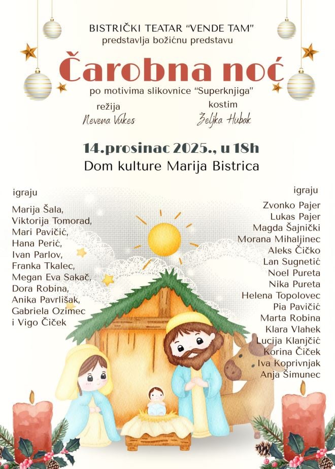 Bistrički teatar ''Vende tam'' predstavlja novu božićnu predstavu ''Čarobna noć'', nastalu po motivima popularne slikovnice ''Superknjiga''. Premijera će se održati sutrau 18 sati, u Domu kulture Marija Bistrica. Ova kratka, topla i vizualno raskošna predstava traje 20 minuta te je namijenjena djeci od 4 do 11 godina. Temu predstave prate biblijski motivi koje otkrivaju glavni junaci predstave Ela i Luka uz pomoć svog prijatelja robota Gizme.
