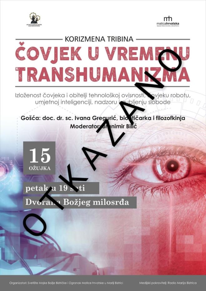 Ogranak Matice hrvatske u Mariji Bistrici i Svetište MBB-e i ove su godine imali u planu organizaciju dvije korizmene tribine. Prva je održana 1. ožujka i imala je veliki odaziv. Druga tribina na rasporedu je trebala biti sutra, u petak 15. ožujka na temu ''Čovjek u vremenu transhumanizma (izloženost čovjeka i obitelji tehnološkoj ovisnosti, čovjeku robotu, umjetnoj inteligenciji, nadzoru i gubljenju slobode)''. No, nažalost tribina je otkazana zbog iznenadne sprijećenosti gošće.