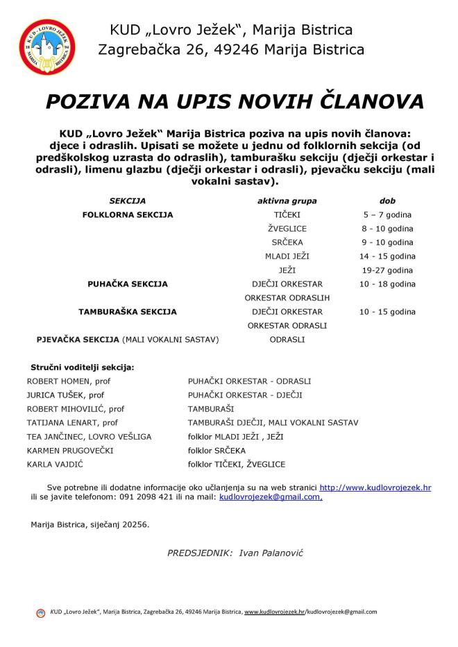 Također, KUD ''Lovro Ježek'' Marija Bistrica poziva i na upis novih članova i to djece i odraslih. Upisati se može u jednu od folklornih sekcija (od predškolskog uzrasta do odraslih), tamburašku sekciju (dječji orkestar i odrasli), limenu glazbu (dječji orkestar i odrasli), te pjevačku sekciju (mali vokalni sastav). Za školu tambure moguće su prijave na brojeve 091 2098 421 i 098 1333 746 ili mail: [email protected], gdje se može doznati i više detalja u vezi upisa novih članova.