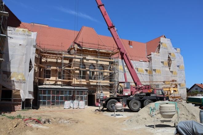 Krovište je sanirano i pripremljeno za završne obloge, a u potkrovlju su u tijeku radovi na ugradbi čeličnih profila, dok se paralelno postavljaju i gips-kartonski. U vanjskom dijelu objekta provode se radovi na uređenju okoliša, izgradnji parkirališta te se provode pripreme za oblikovanje budućeg engleskog vrta.