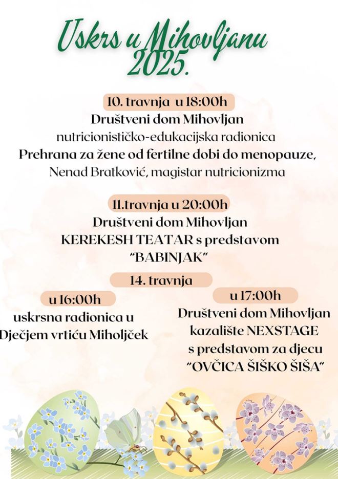 Žitelji Općine Mihovljan mogu pratiti nekoliko događanja pripremljenih povodom nadolazećeg blagdana u sklopu manifestacije Uskrs u Mihovljanu.