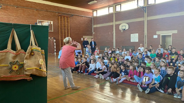 Četvrtak im je bio poseban jer je bio „dan bez ocjena“, a posjetila su ih dva gosta. Prvi je bio gradonačelnik, gospodin Viktor Šimunić koji je srdačno pozdravio sve učenike i učiteljice i zaželio im sretan Dječji tjedan, a druga je dječja književnica i lutkarica Jadranka Čunčić-Bandov, autorica mnogih igrokaza koji su objavljeni u čitankama i dječjim časopisima. Naša gošća izvela je kolaž lutkarsku predstavu „Šale, trice, zvrndalice“ prema istoimenoj knjizi, a lutke koje koristi je sama izradila od različitih predmeta: tikve, spužve, kartona, tkanine. Na kraju predstave učenici su razgledali lutke, malo glumili i fotografirali se. Svojom razigranošću i energijom, pjesmom i plesom, toplinom i humorom lutkarica je oduševila naše mališane pa su je nagradili velikim pljeskom i širokim osmjesima.