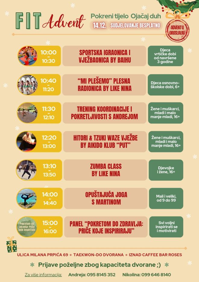 Zahvaljujući sjajnoj inicijativi Nikoline Hegol Martinić i Andreje Mustač u subotu 14. prosinca od 10-16 sati u Taekwon-do dvorani održat će FIT Advent, pod motom „Pokreni tijelo ojačaj duh“. Bit će to dan posvećen kretanju, sportu, plesu i opuštanju, a na svoje će doslovno sve generacije od vrtićevaca do ljudi starije dobi.