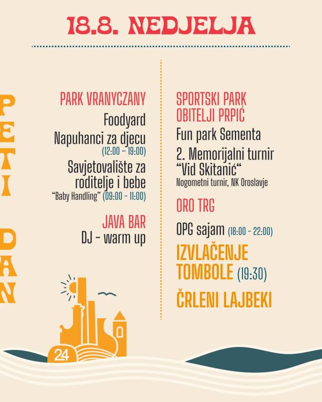Bit će tu koncerti na pozornici na Oro trgu, brojna sportska i kulturna događanja, lunapark i, naravno, velika tombola.