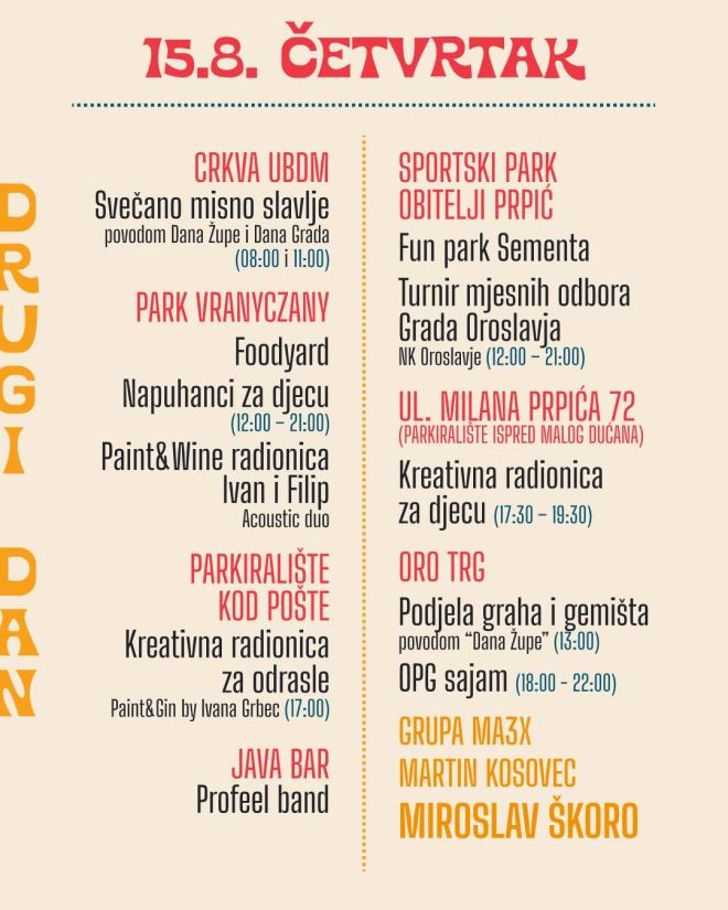 Četvrtak, 15. kolovoza, donosi nastup Martina Kosovca, a potom koncert Miroslava Škore.