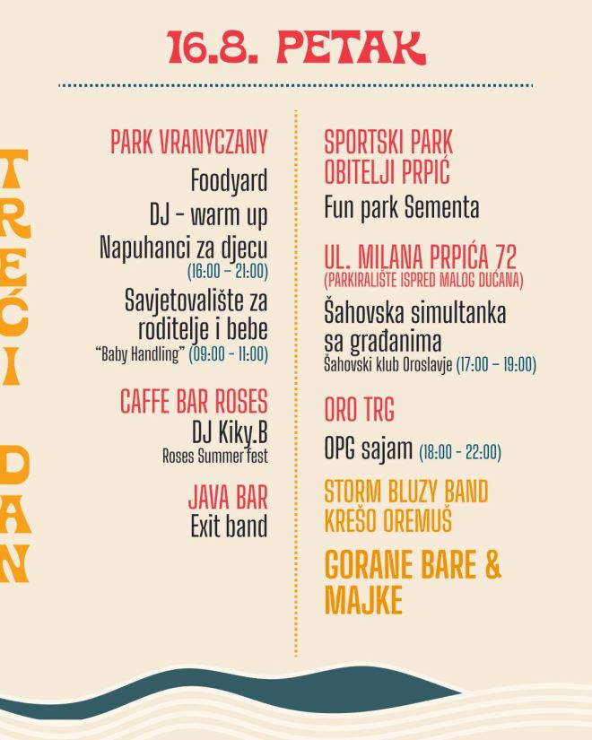 U petak, 16. kolovoza svirat će Kreši Oremuš i Storm Bluzy Band, a nakon njih Goran Bare & Majke.