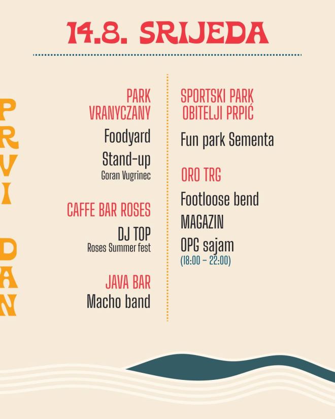 Program počinje u srijedu, 14. kolovoza. Koncert će održati grupa Magazin u 22 sata, a prije njih svirat će Footloose band.