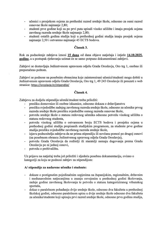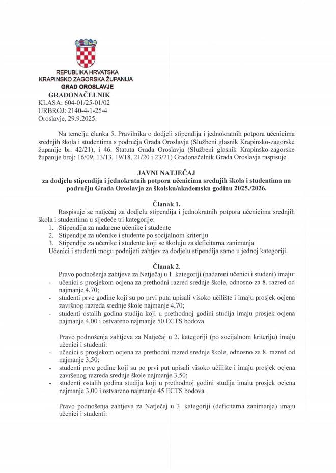 Grad Oroslavje je objavio Javni natječaj za dodjelu Stipendija i jednokratnih potpora učenicima srednjih škola i studentima na području grada Oroslavje za školsku i akademsku godinu 2025/26.