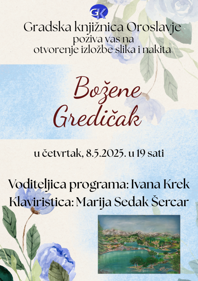 Gradska knjižnica Oroslavje poziva Vas na otvorenje izložbe slika i nakita umjetnice Božene Gredičak, uoči obilježavanja međunarodnog praznika 'Majčin dan'.