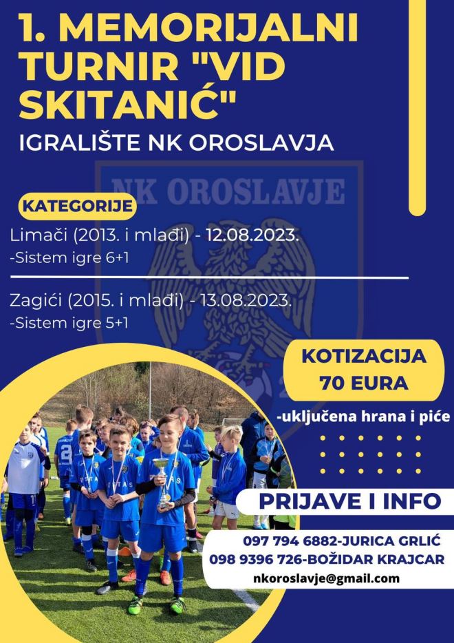 Svi su dobro došli, a kotizacija po momčadi iznosi 70 eura u što su uključeni hrana i piće. Memorijalni turnir "Vid Skitanić" organizira se u sklopu Dana Grada Oroslavja. Prijave za turnir primaju se do 9. kolovoza. Dodatne informacije mogu se dobiti na brojeve mobitela 097/794-6882 (Jurica Grlić) ili 098/9396-726 (Božidar Krajcar) ili putem maila [email protected]