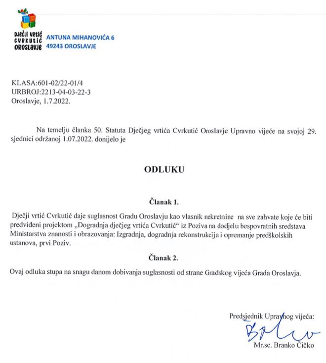 4. Upravno vijeće Vrtića jučer (1.7.2022.g.) je donijelo Odluku kojom se Gradu Oroslavju daje suglasnost koja je preduvjet za prijavu na predmetni natječaj