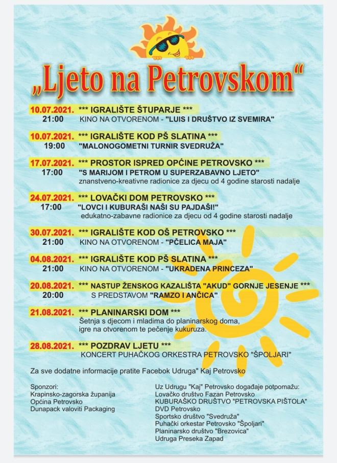 U sklopu Ljeta na Petrovskom, na prostoru ispred Općine Petrovsko 17. srpnja na redu su znanstveno – kreativne radionice za djecu stariju od 4 godine od 17 sati, koje se nastavljaju i 24. srpnja kod Lovačkog doma Petrovsko. Na igralištu kod OŠ Petrovsko 30. srpnja održat će se kino na otvorenom, pa se od 21 sat može pogledati film ‘Pčelica Maja’, a 4. kolovoza na igralištu kod PŠ Slatina film ‘Ukradena princeza’. Žensko amatersko kazalište AKUD Gornje Jesenje nastupit će 20. kolovoza u 20 sati s predstavom ‘Ramzo i Ančica’, a 21. kolovoza planira se šetnja s djecom i mladima do Pla inarskog doma, igre na otvorenom te pečenje kukuruza. 28. kolovoza ‘Pozdrav ljetu’ izvest će Puhački orkestar Petrovsko ‘Špoljari’.