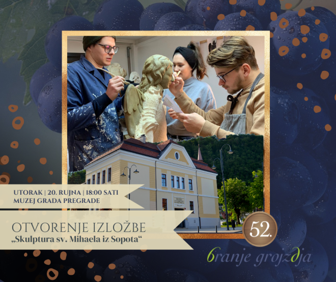 U galerijskom prostoru Muzeja grada Pregrade večeras se otvara izložba pod nazivom „Skulptura sv. Mihaela iz Sopota“. U predvorju Muzeja grada Pregrade bit će postavljen izvornik kamene barokne skulpture, a u galerijskom prostoru muzeja predstavit će se fotografije višegodišnjih konzervatorsko-restauratorskih radova koje su na skulpturi izvodili zaposlenici i studenti Akademije likovnih umjetnosti iz Zagreba.