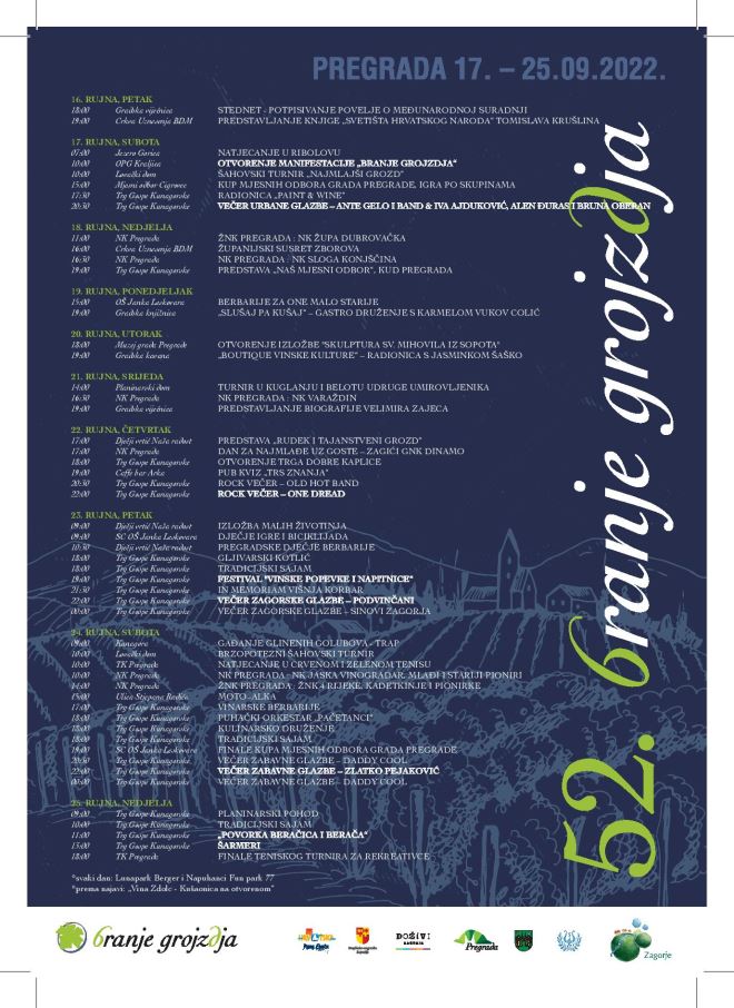 Kruna manifestacije, 52. povorka berača i beračica, održat će se u nedjelju 25. rujna na trgu, od 11 sati. - Nadamo se lijepom vremenu. Povorci će se pridružiti djeca iz vrtića, dječla folklorna sekcija, odrasla sekcija našeg KUD – a, a u goste nam dolazi i KUD Oštrc iz Ruda kraj Samobora.Sve vas pozivamo u Pregradu da posjetite sva događanja, a oni koji imaju narodne nošnje doma, neka se obuku i dođu pridružiti našoj povorci berača i beračica – pozvala je Lucija Vrhovski.