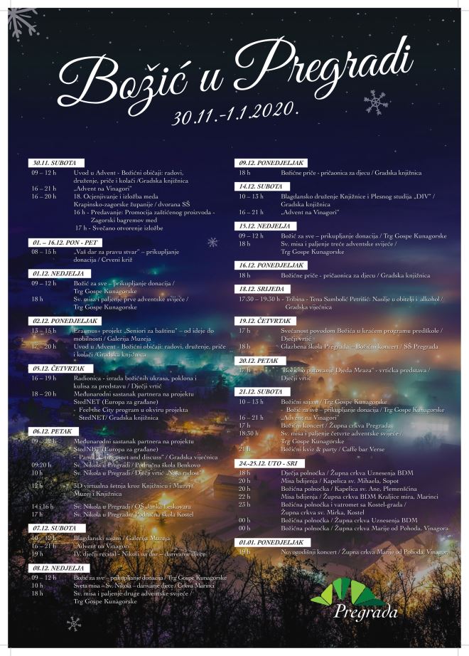 Grad Pregrada i ove godine organizira zanimljiva događanja u mjesecu prosincu okupljena u program pod nazivom „Božić u Pregradi“. U Advent nas uvodi Gradska knjižnica Pregrada zajedno s Udrugom kostelskih žena i Muzejom grada Pregrade već sutra, 30. studenog od 9 sati. Uz mirise i okuse božićnih kolača, pričat ćemo o božićnim običajima, slušati božićne pjesme, a moći ćete razgledati radove članica Udruge kostelskih žena na temu Adventa. U 16 sati otvara se sada već tradicionalni „Advent na VInagori“ na kojem možete razgledati adventski sajam, potom slijedi sveta misa uz blagoslov adventskih vjenčića te „Pozdrav Mariji“ adventskim pjesmama u izvedbi KUD-a Velika Horvatska od 19 sati.