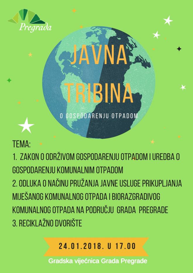 Sutra, 24. siječnja u prostorijama Gradske vijećnice Grada Pregrade održat će se Javna tribina o gospodarenju otpadom.