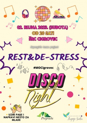 Mladi iz Cigrovca u subotu 02. rujna od 20 sati organiziraju disko večer za mlade u sklopu pobjedničke ideje Rest&De-stress koja se financira kroz projekt Grada Pregrade „Uzmi pare i napravi nešto za mlade“.