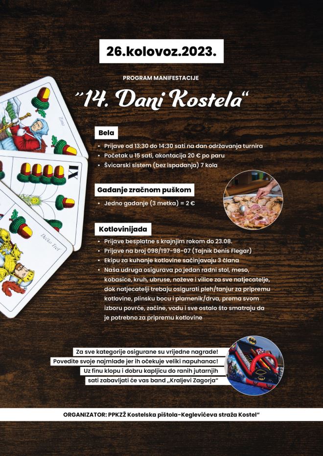Povijesna postrojba "Kostelska pištola-Keglevićeva straža Kostel" ovog vikenda organizira Dan Kostela na igralištu kod područne škole Kostel, u subotu 26. kolovoza.