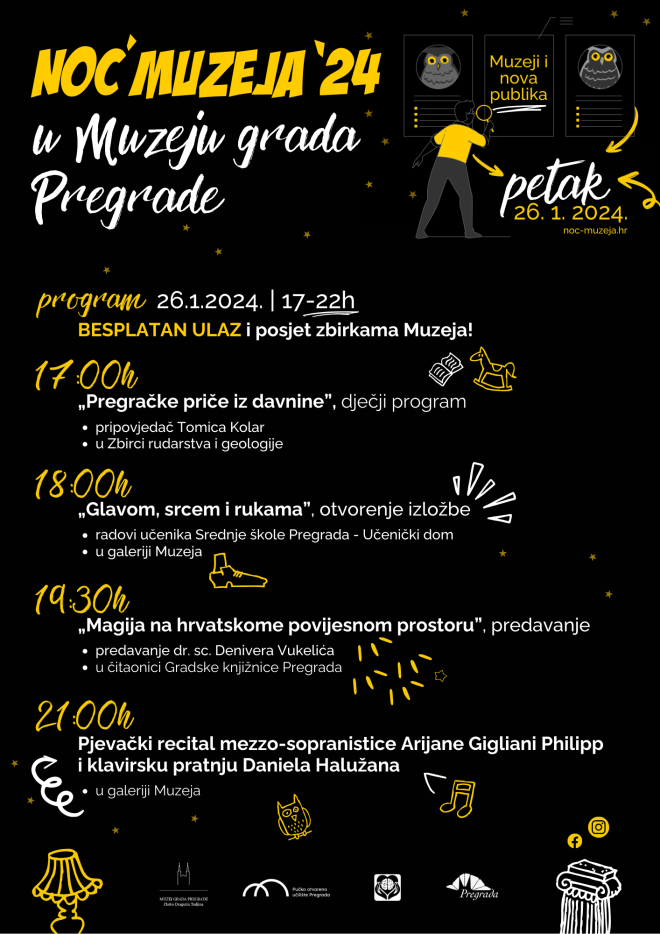 Muzej grada Pregrade Zlatko Dragutin Tudjina uključuje se u manifestaciju organizacijom niza zanimljivih događanja za sve dobne uzraste. Manifestacija „Noć muzeja“ održat će se u petak, 26. siječnja 2024., a tema ovogodišnje manifestacije glasi „Muzeji i nova publika“.