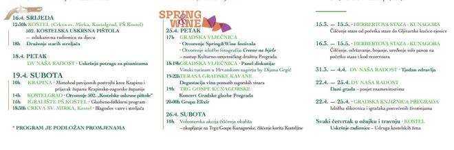 Nezaobilazni dio proljetnog programa je i 502. izdanje Kostelske uskrsne pištole, manifestacije koja se tradicionalno održava u tjednu nakon Uskrsa. Svečano otvorenje manifestacije bit će na Veliku subotu, 19. travnja na Kostelgradu, a događanja će trajati sve do Dana grada Pregrade, koji se slavi 27. travnja.