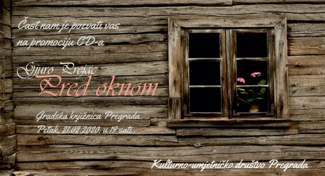 Kulturno – umjetničko društvo Pregrada poziva na promociju CD-a Gjuro Prejac Pred Oknom u Gradskoj knjižnici u Pregradi u petak 21. veljače u 19 sati.