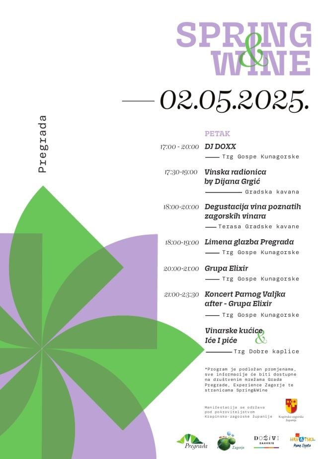 Manifestacija "Spring & Wine" održat će se u petak, 2. svibnja u Pregradi, pod pokroviteljstvom Krapinsko-zagorske županije.