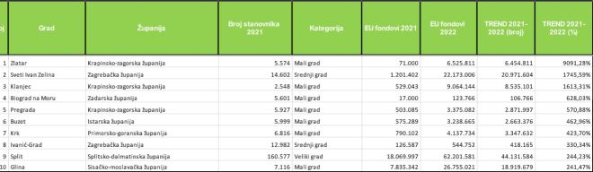 Grad Zlatar imao je u prošloj godini najviše postotno povećanje u povlačenju EU novca među gradskim središtima u RH, rekordno u odnosu na prethodnu godinu (+9.091,28 posto, odnosno 71.000- 6.525.811 kuna). Pokazala je to najnovija analiza podataka Ministarstva financija o konsolidiranim proračunima 128 hrvatskih gradova za 2022. godinu, koju je proveo portal Gradonačelnik.hr.
