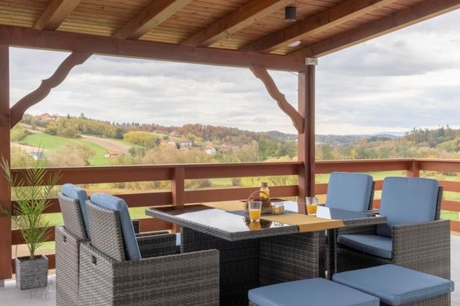 Uz uređenu okućnicu koja nudi veliki bazen s tušem te natkrivenom i otvorenom terasom, roštilj, kućicu za igru, parking, kuću krasi i pomno uređen interijer u kojem prevladava drvo te svijetli i umirujući tonovi. Kuća se sastoji od prizemlja u kojem je prostrani dnevni boravak s kuhinjom i blagovaonom, kupaonica, igraonica za djecu sa stolnim nogometom, PS 4 igraćom konzolom i društvenim igrama te prostrana terasa koja zove na odmor i na druženje.