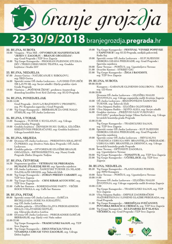 Predsjednica KUD-a Pregrada Slavica Vidaček najavila je drugi po redu festival Vinske popevke i napitnice u njihovoj organizaciji, predstavu KUD-a Sveti Križ Začretje 'Poštene žene' te sudjelovanje u povorki berača.  Rekla je kako će se na festivalu vinskih popevki okupiti 15 izvođača, a festival će otvoriti prošlogodišnje pobjednice Lire iz Đurmanca.  Dragutin Bračun ispred pregradske udruge vinara pozvao na degustaciju vina. Bogat dječji program  predstavila je direktorica Turističke zajednice područja Srce Zagorja Karolina Hostić najavivši predstave, plesna događanja, dječju biciklijadu, Dan ljubaznosti u prometu i druge zanimljive sadržaje za najmlađe kroz svih devet dana manifestacije te tradicijski sajam s domaćim autohtonim proizvodima  u organizaciji TZP Srce Zagorja.  Manifestacija završava središnjom svečanošću povorkom berača i beračica u nedjelju 30. rujna od 11 sati. Organizatori su pozvali sve na najveseliju manifestaciju u Zagorju.