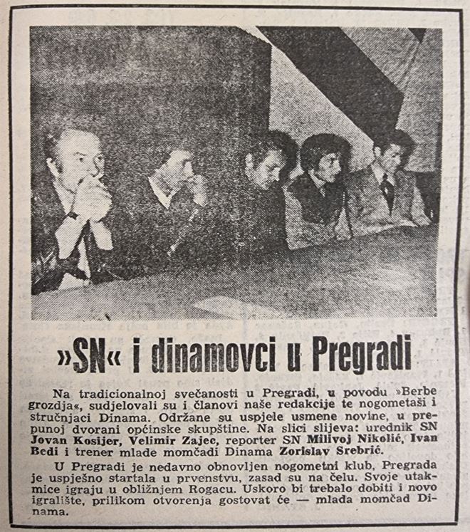 Uoči nedjeljne promocije svoje biografije u Pregradi, jedna od najvećih legendi Dinama, Velimir Zajec na svojem je Facebooku objavila fotografiju od prije 45 godina u istoj prostoriji, Gradskoj vijećnici Pregrade.